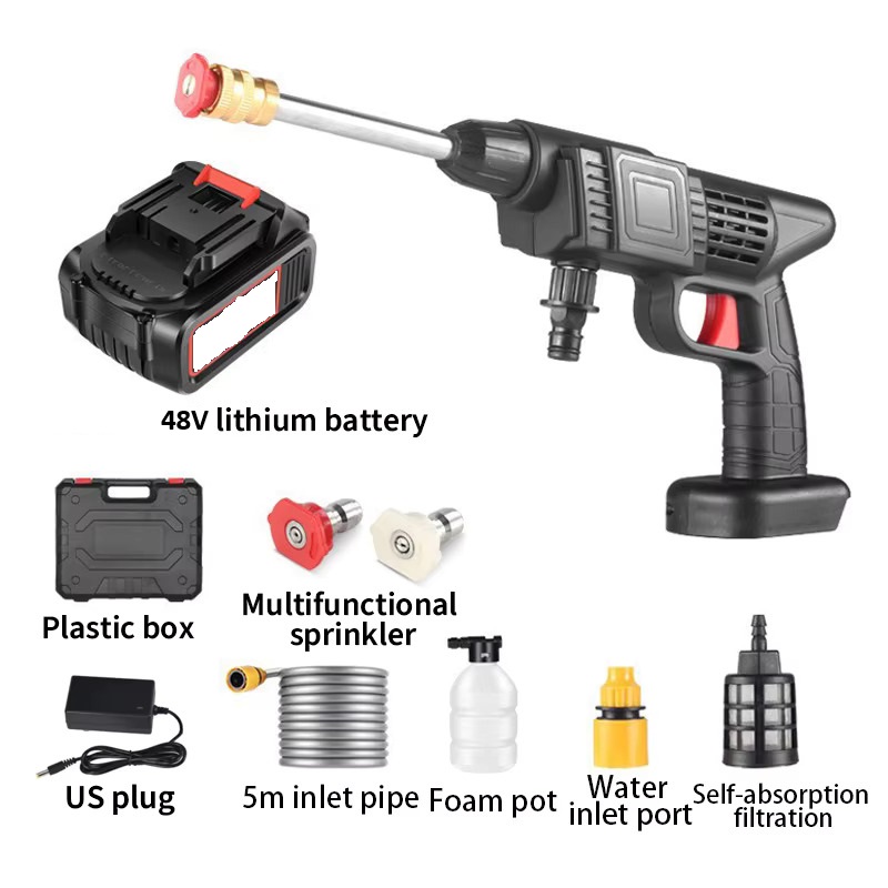 El juego incluye 1 caja de almacenamiento, 1 pistola de agua, tubería de agua de 16,4 pies (5 m), 1 batería de 48 V, 1 cargador, 1 bote de burbujas, 2 salidas de agua, 1 junta a presión, 1 filtro y 1 acero inoxidable barra larga